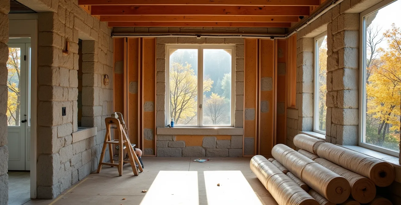 Le cœur de la performance énergétique réside dans l’isolation. Mais pour une maison ancienne, l’approche « plus il y en a, mieux c’est » est une recette pour le désastre. Les bâtiments construits avant les années 80 ont été conçus pour « respirer ». Leurs murs, souvent en maçonnerie ou en bois massif, ont une certaine perméabilité à la vapeur d’eau. Les envelopper dans des isolants modernes non perméables, comme des mousses plastiques à cellules fermées, c’est leur enfiler un sac plastique. L’humidité naturelle de la maison, ne pouvant plus s’échapper à travers les murs, se retrouve piégée, créant un risque majeur de condensation, de pourriture de la charpente et de moisissures.